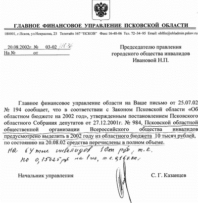 На той же сессии городская Дума постановила: «Администрации города выделить городскому обществу инвалидов 50,0 тыс. руб. из средств, предусмотренных статьей «Финансовая помощь общественным и иным организациям» в бюджете Пскова на 2002 год». По словам членов правления общества, финансовое управление города вместо того, чтобы выполнить решение Думы и перечислить эти деньги общественной организации инвалидов, перечислило их на счет управления социальной защиты населения администрации г. Пскова.