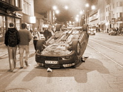 Толпа упорно игнорировала требования полиции покинуть Тынисмяги. На водомете уже с час дежурили двое "стрелков", что породило очередной анекдот: "Мол, сегодня у нас чистый четверг, когда мыло привезут?". Уговаривать было бесполезно. Люди не расходились. Около десяти часов вечера спецназ пошел на штурм. Началось некоторое подобие паники. У припаркованного рядом с библиотекой автомобиля побили стекла, после того как кто-то выкрикнул "круши все!". Толпа озверела. В спецназ полетели камни. Начали бить двери Национальной библиотеки. Ломалось все, что могло ломаться, кидалось все, что могло кидаться. Второй автомобиль был припаркован почти что перед самим спецназом. Прогремели взрывы. Как выяснилось, это были взрывпакеты. Отступающая толпа все громче кричала "позор!". …Переворачивались помойки, громилось Министерство юстиции и бились стекла первых этажей. Пожилой женщине стало плохо. Она остановилась и потребовала скорой, за что получила струю газа. Жестокость достигала кульминации. Подарком для самых буйных оказалась штаб-квартира партии Реформ. В этом здании не осталось ни одного не побитого стекла. На Пярнуском шоссе было перекрыто движение. Толпа попыталась перевернуть автобус. Испуганные жители окрестных домов выходили из домов и просили не бить их машины. Начали биться витрины магазинов. Полиция была бессильна. В женский магазин побежали девушки, в алкогольный - мужчины. И меня уже не удивляло, что говорили они и на эстонском, и на русском. В городе воцарилась безвластие. Алкогольный магазин был вычищен подчистую, а алкоголь "национализирован" под крики: ''Ансип угощает!". У зубной поликлиники оставалось человек 300. Ближе к одиннадцати на улице Эндла спецназ пошел еще на один штурм, тесня толпу в сторону района Крийстине. По неподтвержденным данным, были применены водометы."