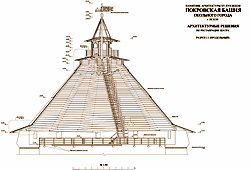 | Архитектурное решение реставрации шатра Покровской башни. Фасад со стороны входа. Апрель 2010 года. Псковский филиал ФГУП «Институт «Спецпроектреставрация». |