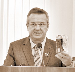 | Депутат Александр Рогов продемонстрировал коллегам знание цен на продукты питания. Фото: Артем Аванесов, «Псковское агентство информации» |